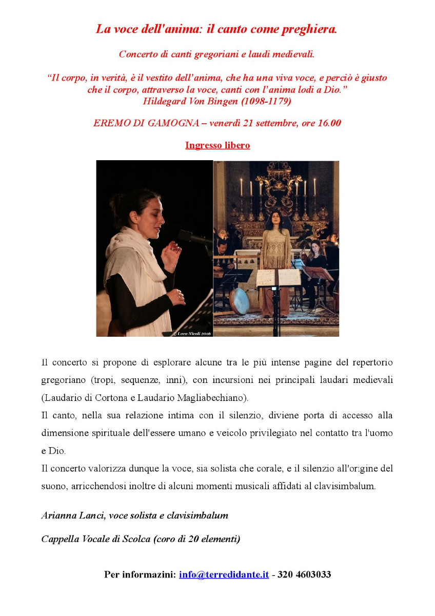 Il concerto si propone di esplorare alcune tra le più intense pagine del repertorio gregoriano (tropi, sequenze, inni), con incursioni nei principali laudari medievali (Laudario di Cortona e Laudario Magliabechiano).