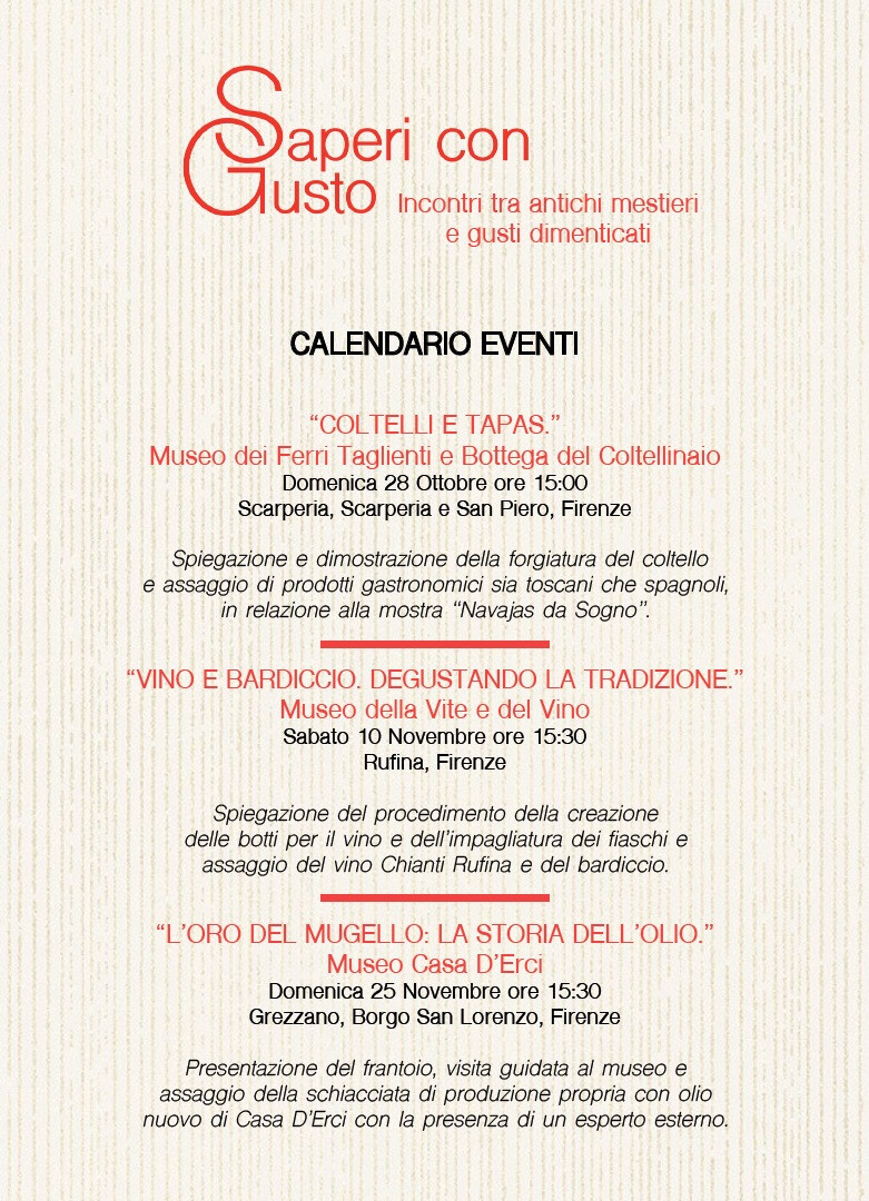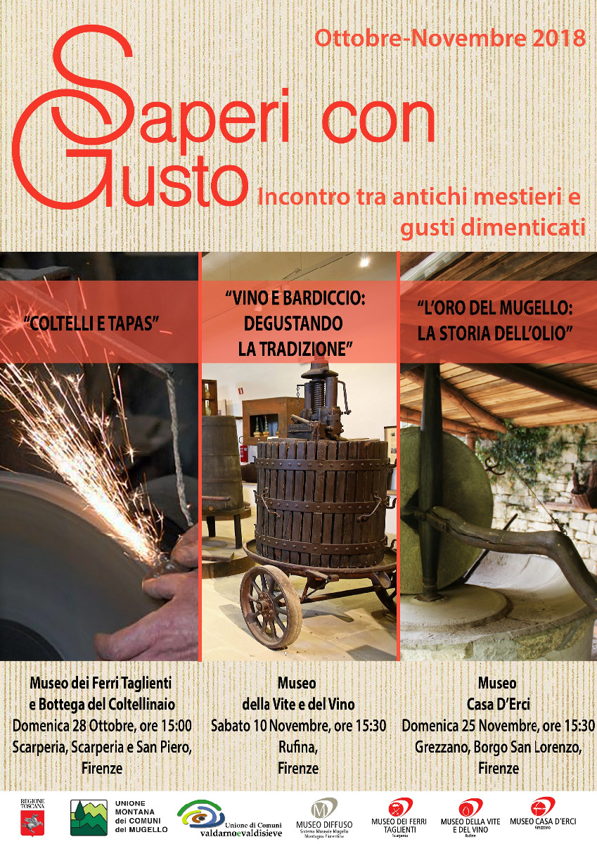 il Sistema Museale Diffuso, nell'ambito della campagna nazionale del MiBACT “2018, Anno del Cibo Italiano”, promuove questa nuova iniziativa culturale con tre incontri - 28 ottobre, 10 e 25 novembre - che illustreranno il “genio artigiano” degli antichi mestieri insieme alla gastronomia locale tipica della stagione autunnale. Così, nell’Antica Bottega del Coltellinaio del Museo dei Ferri Taglienti si apprenderanno i segreti del mestiere del coltellinaio attraverso la realizzazione di un coltello, dalla forgiatura della lama, alla modellazione del manico in corno di bue, fino ad arrivare all’affilatura e lucidatura. E se al Museo della Vite e del Vino due artigiani, un bottaio ed un impagliatore, spiegheranno il procedimento della creazione delle botti per il vino e dell'impagliatura dei fiaschi, al Museo di Casa d’Erci si darà dimostrazione della produzione dell’olio attraverso le complesse operazioni nel frantoio.