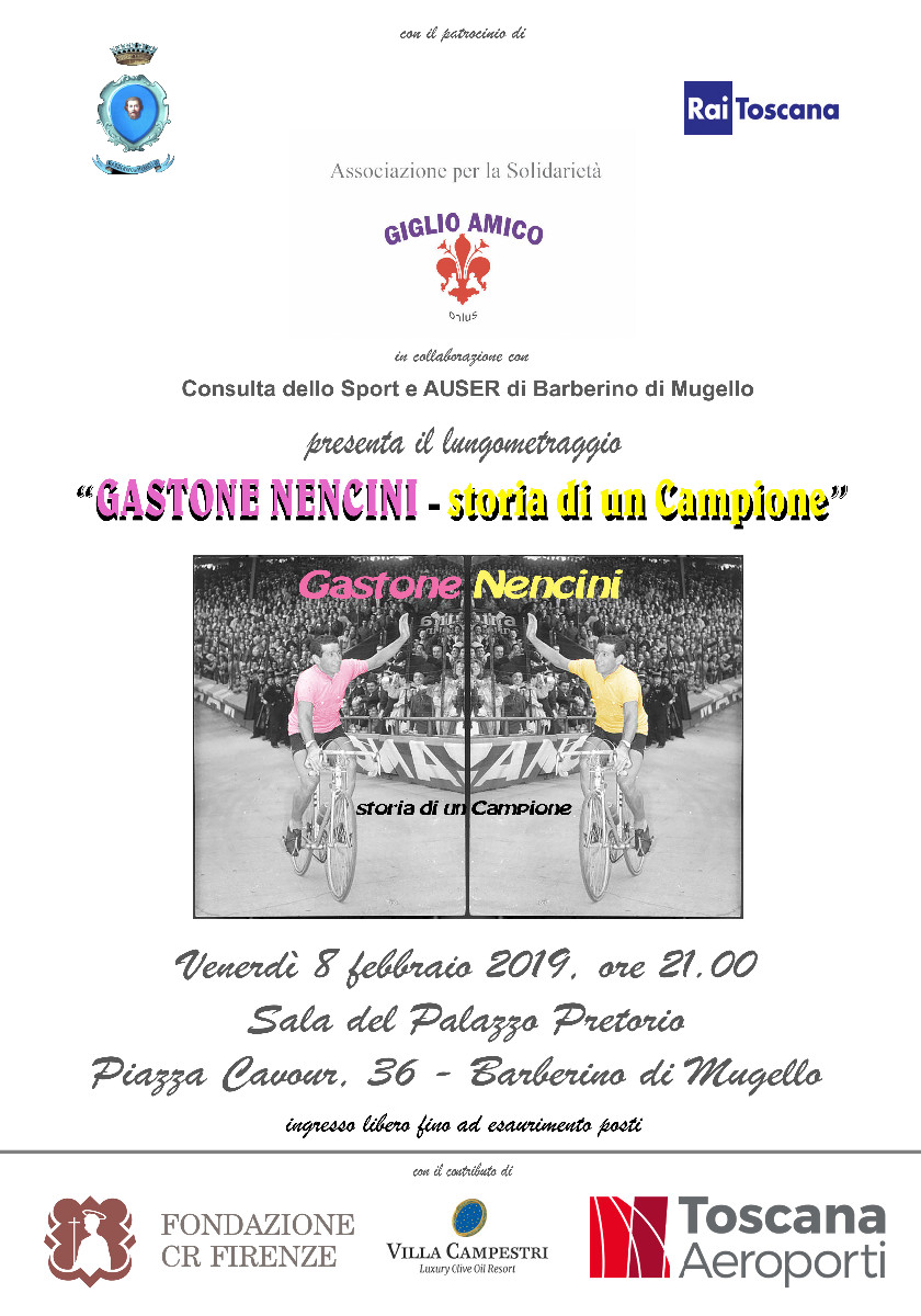 Proiezione, venerdì 8 febbraio alle ore 21 presso la Sala di Palazzo Pretorio, del lungometraggio-documentario inedito "GASTONE NENCINI. Storia di un Campione", a cura di Marco Vichi e Sandro Picchi. Il lungometraggio, finalizzato alla raccolta di fondi per le attività istituzionali dell'Associazione per la Solidarietà Giglio Amico onlus (www.giglioamico.it), è stato realizzato con la preziosa collaborazione della Rai, Sede Toscana, e delle Teche Nazionali Rai e grazie agli archivi di numerosi collezionisti privati.
