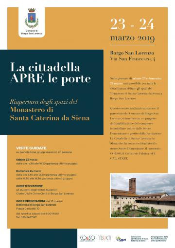 Il Monastero di Santa Caterina aprirà le porte con visite guidate gratuite su prenotazione: il sabato dalle 14.30 alle 16.30 e domenica, dalle 9.30 alle 12.30 e dalle 14.30 alle 16.30. Guide d'eccezione saranno gli studenti degli istituti superiori Giotto Ulivi e Chino Chini. Info presso la biblioteca comunale
