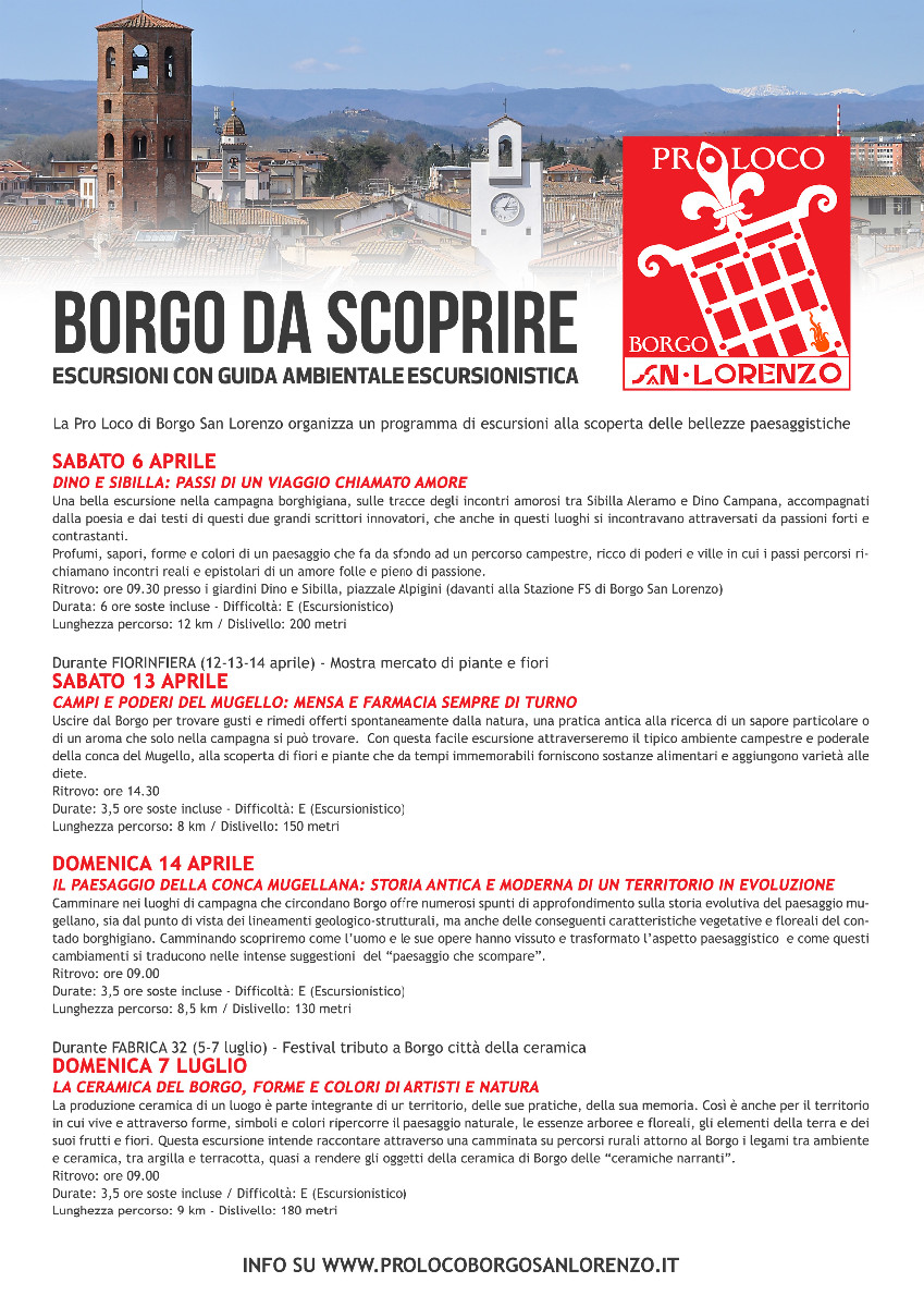 Si inizia sabato 6 aprile con Dino e Sibilla: passi di un viaggio chiamato amore, una bella escursione nella campagna borghigiana, sulle tracce degli incontri amorosi tra Sibilla Aleramo e Dino Campana, accompagnati dalla poesia e dai testi di questi due grandi scrittori innovatori, che anche in questi luoghi si incontravano attraversati da passioni forti e contrastanti. Profumi, sapori, forme e colori di un paesaggio che fa da sfondo ad un percorso campestre, ricco di poderi e ville in cui i passi percorsi richiamano incontri reali e epistolari di un amore folle e pieno di passione per un percorso escursionistico di sei ore soste incluse e 12 chilometri.
