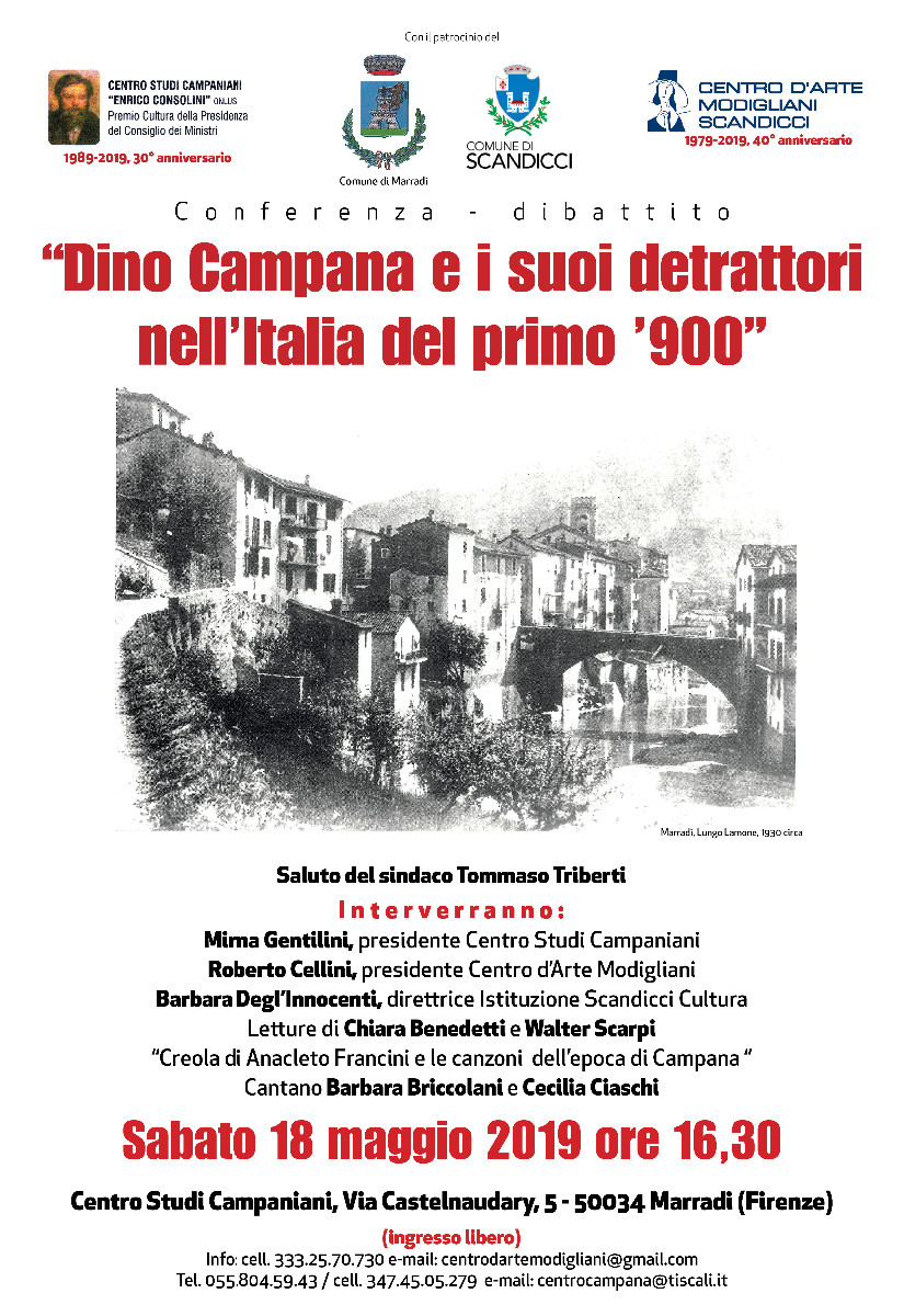 Questo è quanto si prefigge la conferenza dibattito “Dino Campana e i suoi detrattori nell’Italia del primo 900” organizzata dal Centro Studi Campaniani in collaborazione con il Centro d’Arte Modigliani e il patrocinio dei Comuni di Marradi e Scandicci che si svolgerà con il seguente programma: Saluto di Tommaso Triberti. sindaco di Marradi,Interverranno : Mirna Gentilini, presidente Centro Studi Campaniani, Roberto Cellini, presidente Centro D’Arte Modigliani, Barbara Degl’Innocenti, direttrice Istituzione Scandicci Cultura. Letture di Chiara Benedetti e Walter Scarpi. “ Creola di Anacleto Francini e le canzoni dell’epoca di Campana” cantano Barbara Briccolani e Cecilia Ciaschi.