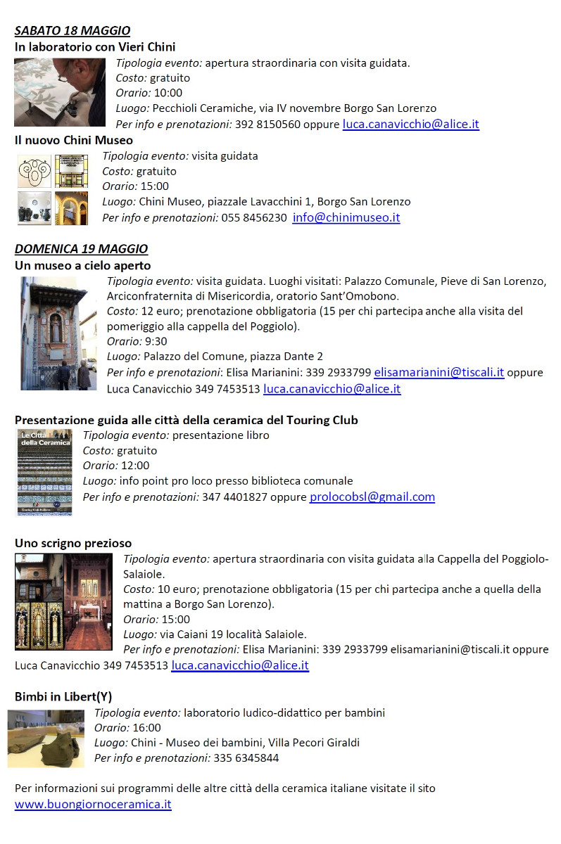 Per avere tutte le informazioni sui programmi delle altre città della ceramica italiane, oltre che per quelli di Borgo San Lorenzo, visitate il sito www.buongiornoceramica.it