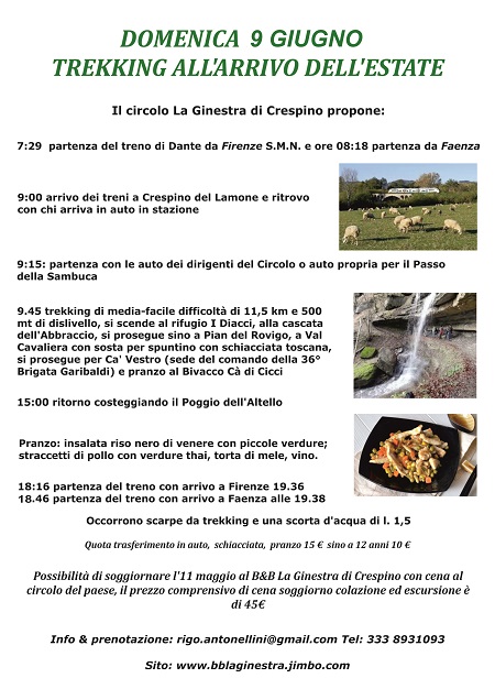 Una volta raggiunto il Passo della Sambuca si scende al Rifugio I Diacci, alla cascata dell'Abbraccio, poi si prosegue fino a Pian del Rovigo e Val Cavaliere. Sosta per merenda e proseguimento verso Ca' Vestro (sede del comando della 36^ Brigata Garibaldi) e pranzo al Bivacco Cà di Cicci. Clicca qui per leggere il programma completo