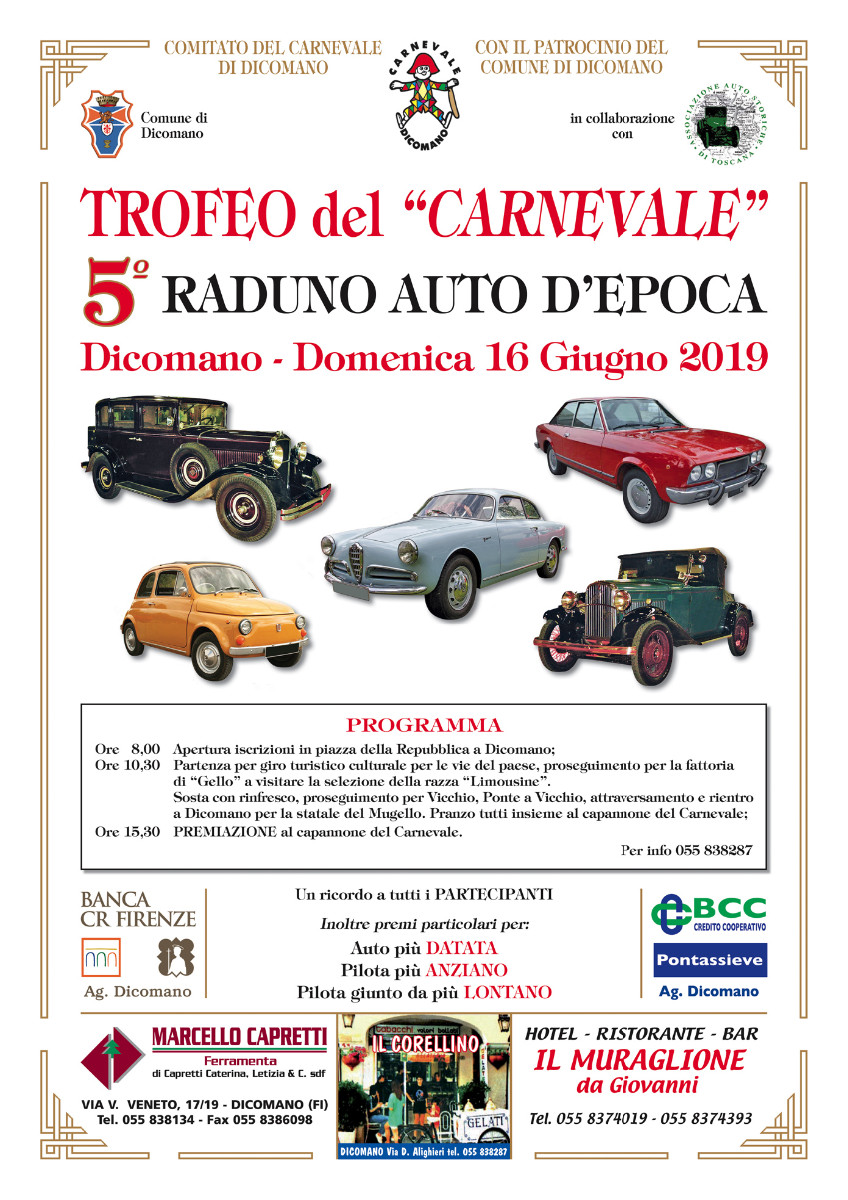 ore 10.30 partenza per giro turistico-culturale per le vie del paese, proseguimento per la fattoria di "Gello" a visitare la selezione della razza "Limousine". Sosta con rinfresco, proseguimento per Vicchio, Ponte a Vicchio, attraversamento e rientro a Dicomanoper la statale del Mugello. Pranzo tutti insieme al Capannone del Carnevale.