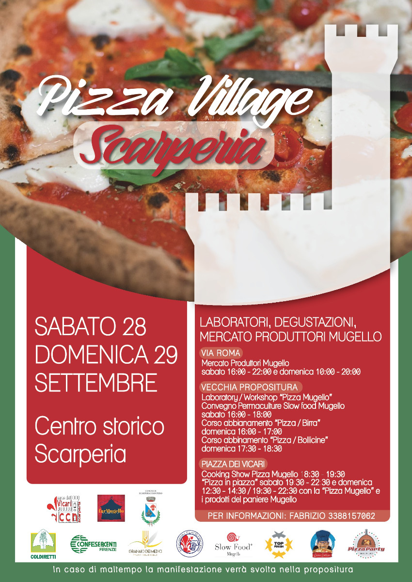 Il Nuovo CCN Corte dei Vicari da un’idea di Marco Ugolini e di Fabrizio Guerrini di Farmugello organizza sabato 28 e domenica 29 settembre 2019, un festival di due giorni dedicato al mondo della pizza con l’obbiettivo di coinvolgere i professionisti della pizza e i produttori del territorio per la creazione della pizza Mugello esclusivamente con prodotti a KM0. Saranno presenti laboratory/workshop in collaborazione con Giovanni Santarpia, sulle nozioni base della pizza nel formato “Romana”, “Napoletana” e “Gourmet” utili per imparare i trucchi del mestiere e i giusti abbinamenti tra farine e ingredienti da utilizzare per la realizzazione della pizza Mugello, insieme ai topping realizzati direttamente dal paniere del Mugello, messo a disposizione dal Granaio dei Medici per gli Chef dell’Associazione Cuochi Fiorentini. Gli ingredienti potranno esser reperiti dai fruitori all’evento lungo via Roma, dove sarà allestito un mercato dei produttori a cura di Slow Food Mugello, oltre al convegno delle Permacultura nella Vecchia propositura. Inoltre si terranno corsi di abbinamento pizza e birra e pizza e bollicine grazie alla collaborazione del docente Fisar Marco Ugolini. Nei giorni di sabato e domenica sarà possibile degustare le pizze speciali realizzate per la manifestazione in p.zza dei Vicari di Scarperia, in caso di maltempo la manifestazione si sposterà nella vecchia Propositura, situata adiacente alla piazza.