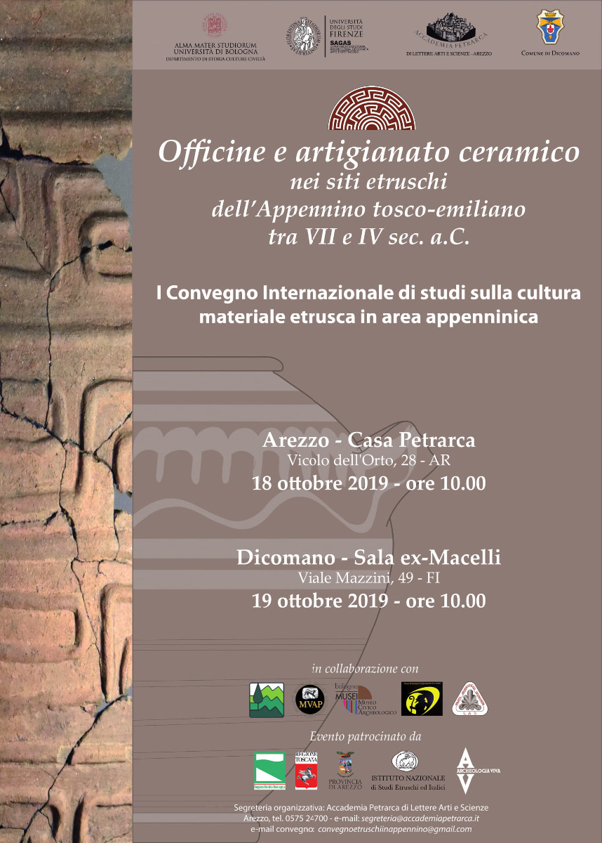 Il convegno internazionale si svolgerà a in due giornate (18-19 ottobre 2019) tra Arezzo e Dicomano ed è organizzato dall’ Alma Mater Studiorum- Università di Bologna, dall'Università degli Studi di Firenze, dall’ Accademia Petrarca di Lettere Arti e Scienze di Arezzo, nonché dal Comune di Dicomano col cofinanziamento dell’Unione Montana dei Comuni del Mugello e con la partecipazione del Gruppo Archeologico di Dicomano. L’evento è patrocinato dall’Istituto Nazionale di Studi Etruschi ed Italici, da Regione Toscana, da Regione Emilia-Romagna, dalla Provincia di Arezzo e da Archeologia Viva. Alla sua organizzazione hanno collaborato anche prestigiosi partner, quali l’Istituzione Bologna Musei-Museo Civico Archeologico di Bologna e Mugello Valley Archeological Project. Riteniamo che la giornata di studi a Dicomano, oltre a offrire un importante contributo all’approfondimento e ricerca sulla cultura etrusca dell’Appennino, rappresenti per l’intero territorio un’opportunità culturale di crescita e un modo per far conoscere le proprie ricchezze storico-archeologiche.