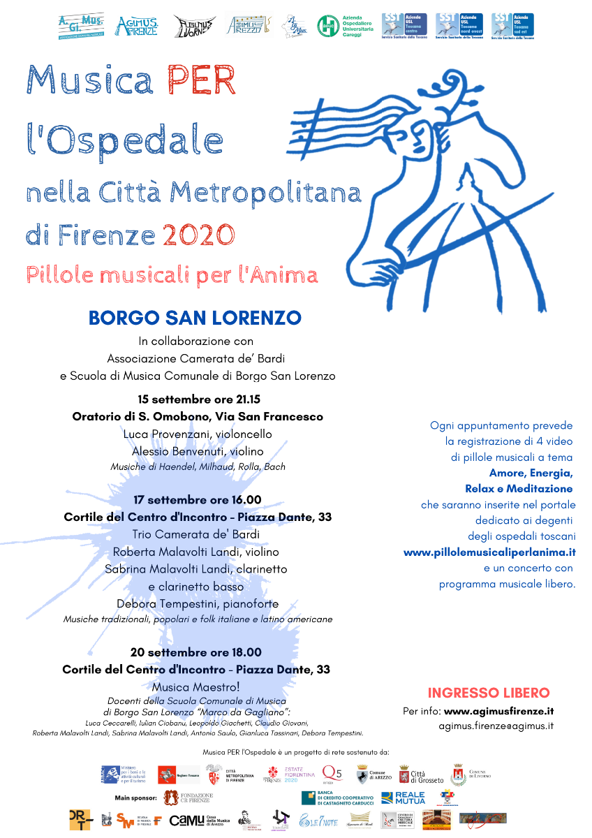 A.Gi.Mus. (Associazione Giovanile Musicale) Firenze e Camerata de' Bardi si uniscono nuovamente in un tris di appuntamenti dedicati all'Ospedale del Mugello; tris inserito in un più ampio contesto di eventi a carattere regionale titolato 'Musica PER l'Ospedale nella Città Metropolitana di Firenze 2020'.