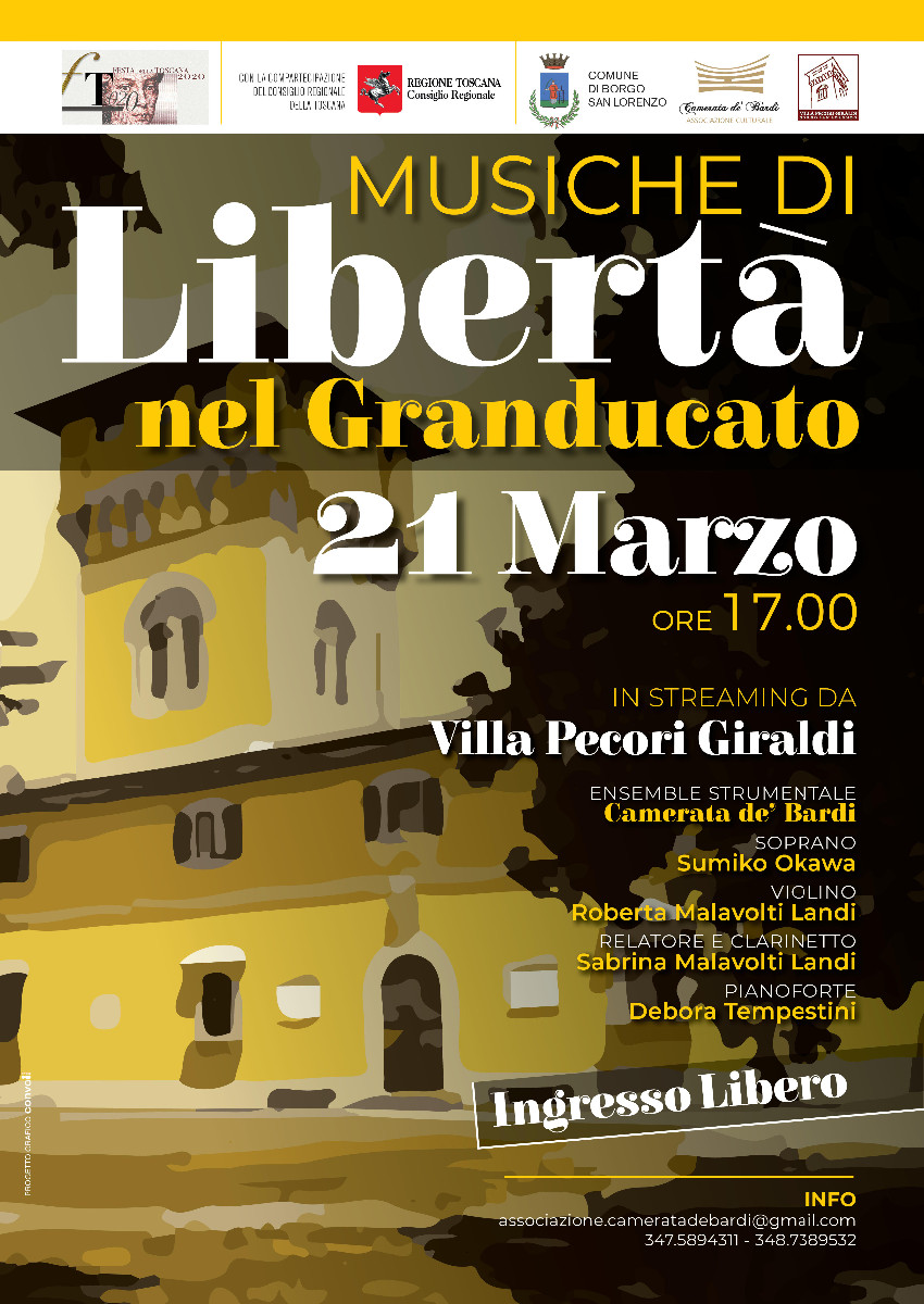 Domenica 21 marzo 2021, alle ore 17.00, in streaming dalla Sala Galileo di Villa Pecori-Giraldi, sulla pagina facebook della Scuola Comunale di Musica di Borgo San Lorenzo della Camerata de' Bardi, al seguente link https://it-it.facebook.com/camerata.debardi.1/, si potrà seguire il Convegno storico-musicale “Musiche di Libertà nel Granducato”, evento gratuito per tutto il pubblico, inserito nel calendario degli eventi per la celebrazione della Festa della Toscana, realizzato con la compartecipazione del Consiglio Regionale della Toscana.