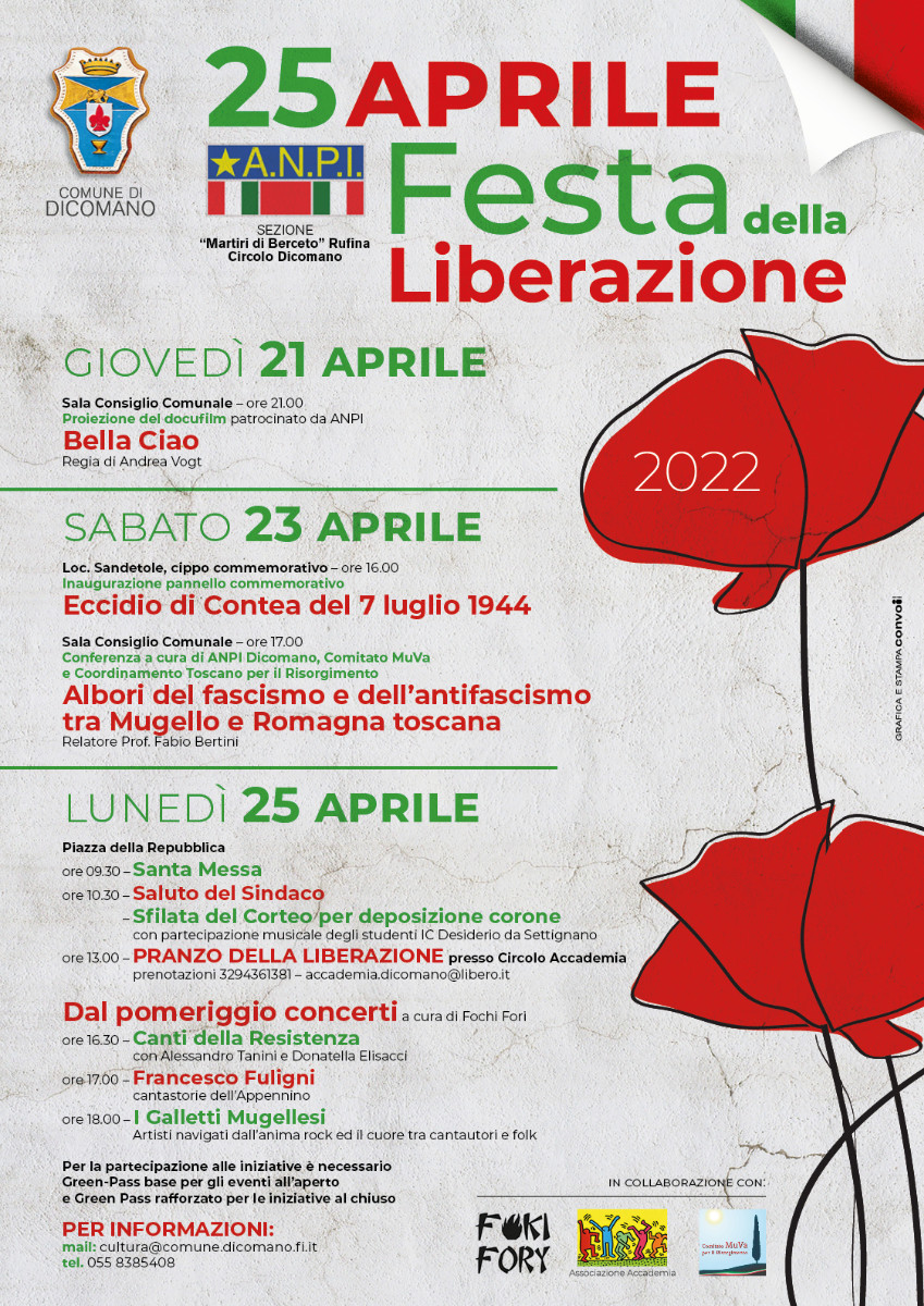 pomeriggio: concerti a cura di Fochi Fori. Dalle 16.30: Canti della Resistenza, Francesco Fuligni, i Galletti Mugellesi.