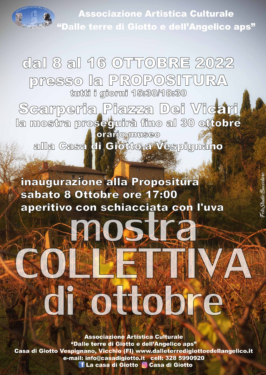 La mostra collettiva di ottobre inizierà nella Vecchia Propositura di Scarperia e San Piero sabato 8 ottobre fino a domenica 16 ottobre e terminerà alla Casa di Giotto a partire da lunedì 17 fino a domenica 30 ottobre 2022.