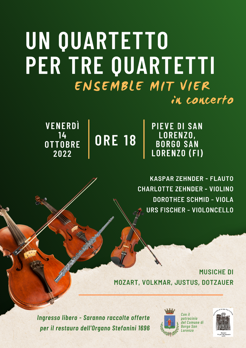 Venerdì 14 ottobre 2022 avrà luogo l'Ensemble mit Vier in concerto presso la Pieve di San Lorenzoalle ore 18:00