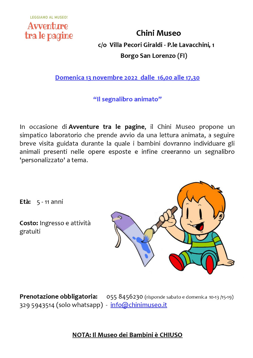 In occasione di Avventure tra le pagine, il Chini Museo propone un simpatico laboratorio che prende avvio da una lettura animata de “Il segnalibro animato”, a seguire breve visita guidata durante la quale i bambini dovranno individuare gli animali presenti nelle opere esposte e infine creeranno un segnalibro 'personalizzato' a tema.