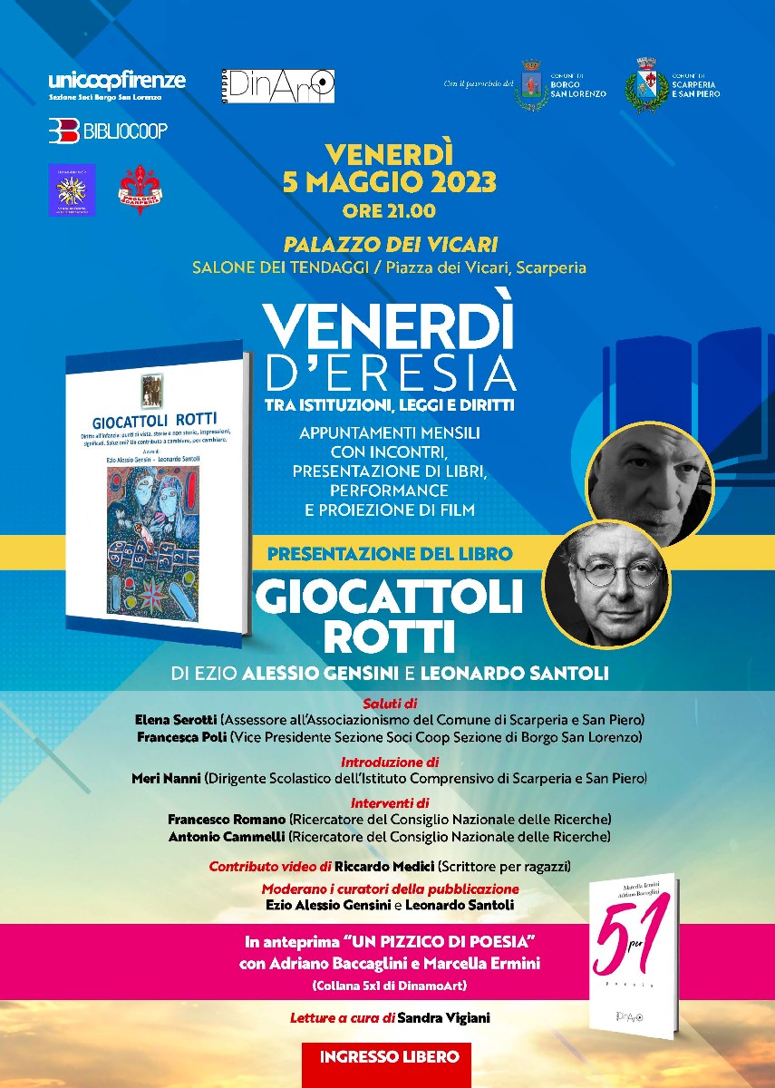 Alle ore 21:00 nel Salone dei Tendaggi del Palazzo dei Vicari Ezio Alessio Gensini e Leonardo Santoli presenteranno la loro opera letteraria “Giocattoli rotti” e in anteprima “Un pizzico di poesia” con la Collana 5x1 della DinamoArt con i testi di Adriano Baccaglini e Marcella Ermini. Saranno presenti l’Assessore all’Associazionismo del Comune di Scarperia e San Piero Elena Serotti e la Vicepresidente della Sezione Soci Coop di Borgo San Lorenzo Francesca Poli. Introduzione di Meri Nanni (Dirigente Scolastico dell'Istituto Comprensivo di Scarperia e San Piero). Interverranno Francesco Romano (Ricercatore del Consiglio Nazionale delle Ricerche) e Antonio Cammelli (Ricercatore associato del Consiglio Nazionale delle Ricerche). Moderano i curatori della pubblicazione Ezio Alessio Gensini (Vicepresidente dell’Associazione Culturale “I colori delle stelle” e Direttore Artistico della rassegna Venerdì d’Eresia) e Leonardo Santoli (Direttore Artistico dell’Associazione culturale I colori delle stelle). Contributo video di Riccardo Medici (Scrittore per bambini). Letture estratte dal libro a cura di Sandra Vigiani.