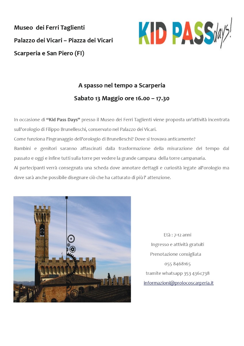 In occasione di “Kid Pass Days” presso il Museo dei Ferri Taglienti viene proposta un'attività incentrata sull'orologio di Filippo Brunelleschi, conservato nel Palazzo dei Vicari. Come funziona l'ingranaggio dell'orologio di Brunelleschi? Dove si trovava anticamente? Bambini e genitori saranno affascinati dalla trasformazione della misurazione del tempo dal passato e oggi e infine tutti sulla torre per vedere la grande campana della torre campanaria. Ai partecipanti verrà consegnata una scheda dove annotare dettagli e curiosità legate all'orologio ma dove sarà anche possibile disegnare ciò che ha catturato di più l' attenzione.