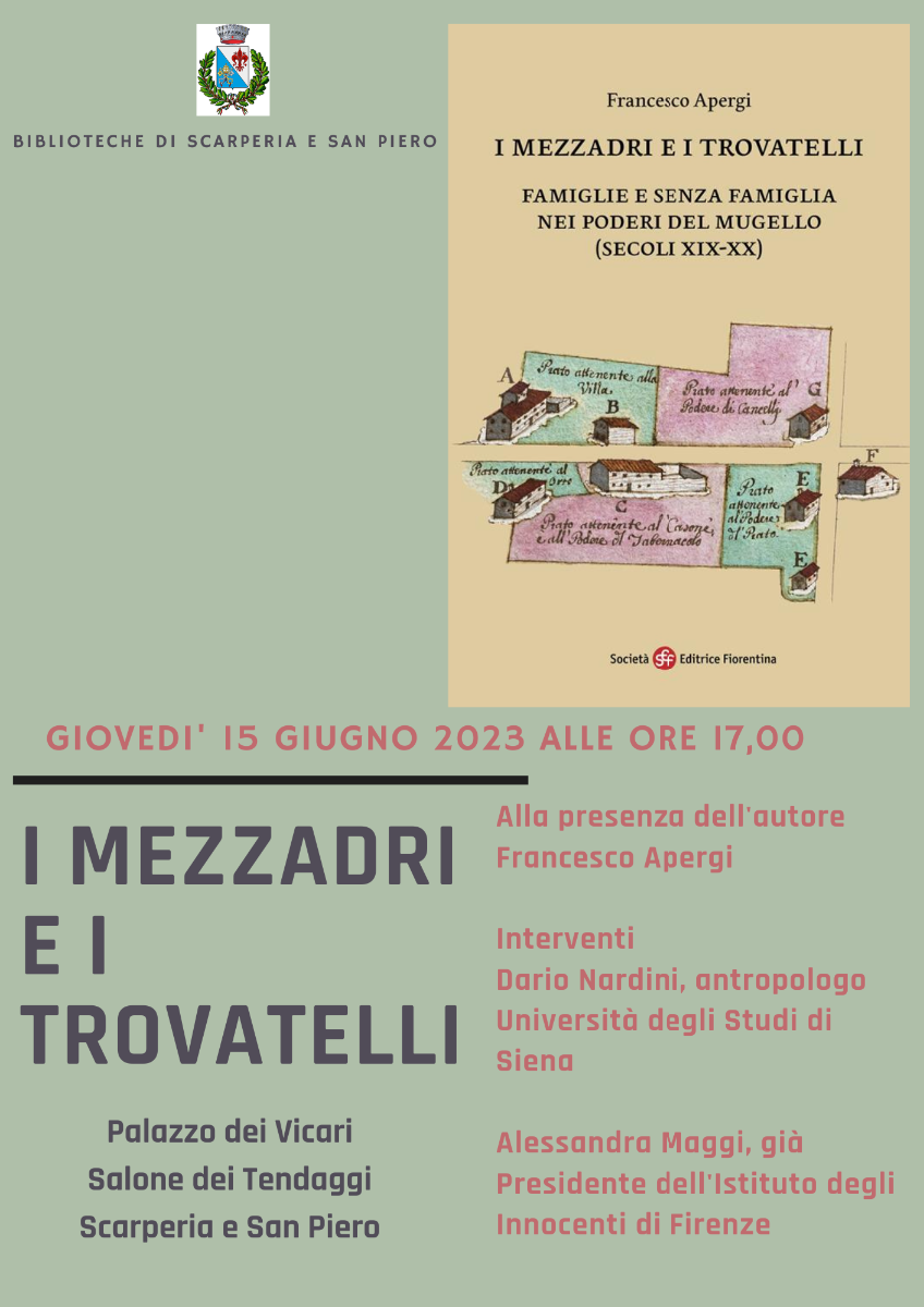 Presentazione del libro “I mezzadri e i trovatelli. Famiglie e senza famiglia nei poderi del Mugello (secoli XIX- XX)”, alla presenza dell’autore Francesco Apergi e con gli interventi di Dario Nardini, antropologo dell’Università degli Studi di Siena e Alessandra Maggi, già Presidente dell’Istituto degli Innocenti di Firenze. Evento a cura delle Biblioteche comunali di Scarperia e San Piero.