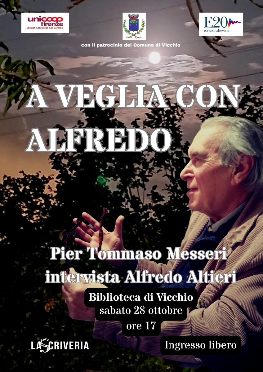 La Biblioteca comunale di Vicchio, L'Associazione E20 – Eccezionali Eventi e la Sezione Soci Coop di Borgo San Lorenzo, con il Patrocinio del Comune di Vicchio, presentano A VEGLIA CON ALFREDO, una intervista – chiacchierata con Alfredo Altieri condotta da Pier Tommaso Messeri.