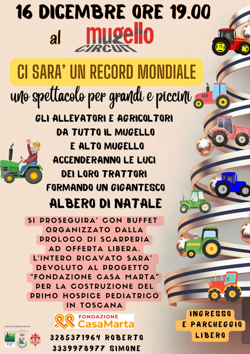 Alle ore 19:00, il record mondiale al Mugello Circuit per creare un gigantesco albero di Natale formato dalle luci dei trattori degli allevatori e agricoltori del Mugello e Alto Mugello.