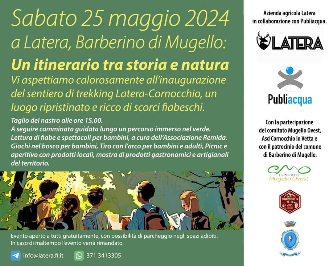 Sabato 25 maggio 2024 a Latera, nel comune di Barberino di Mugello, si terrà “Un itinerario tra storia e natura”, l’inaugurazione del sentiero di trekking Latera-Cornocchio, un luogo ripristinato e ricco di scorci fiabeschi. Realizzato dall’azienda agricola Latera in collaborazione con Publiacqua, scuola Salirù di Cavallina, e con la partecipazione del comitato Mugello Ovest, Asd Cornocchio in Vetta e il patrocinio del comune di Barberino di Mugello.