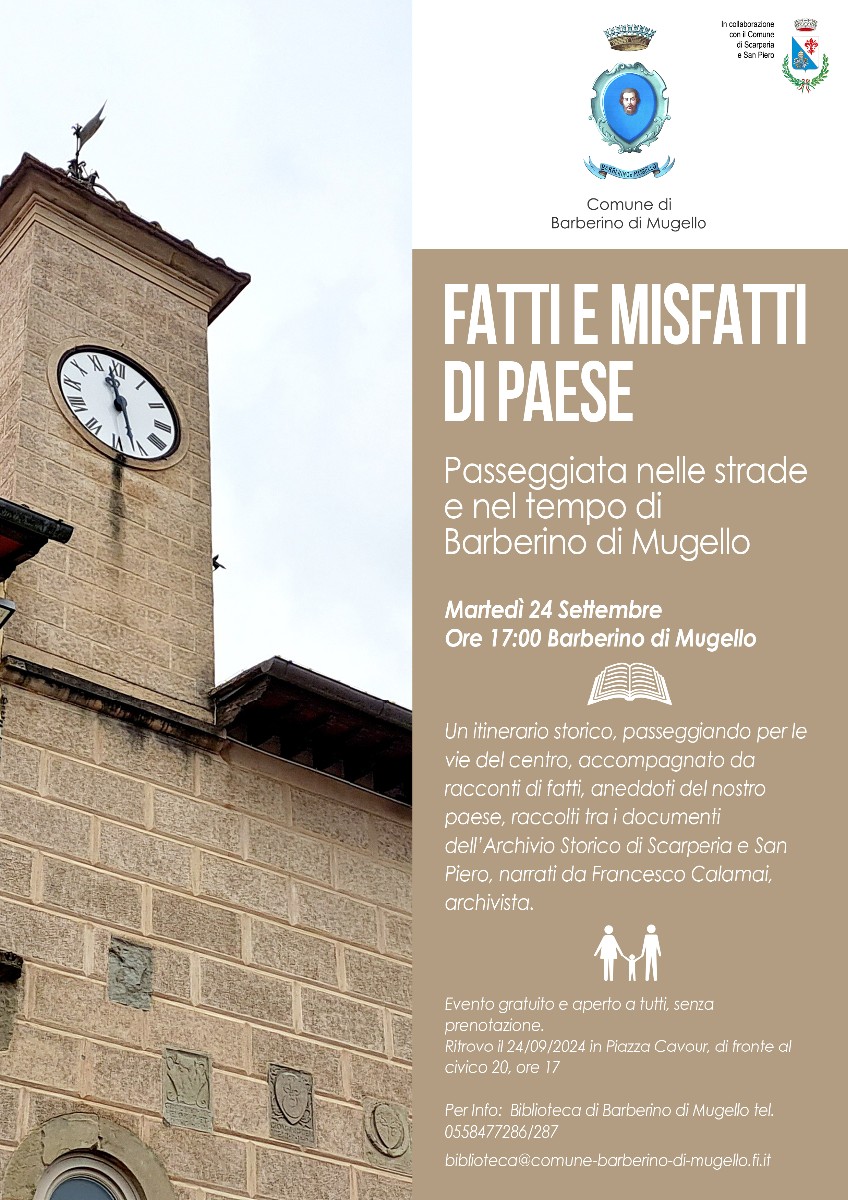Un itinerario storico, passeggiando per le vie del centro, accompagnato da racconti di fatti, aneddoti del nostro paese, raccolti tra i documenti dell'Archivio Storico di Scarperia e San Piero, narrati da Francesco Calamai, archivista.