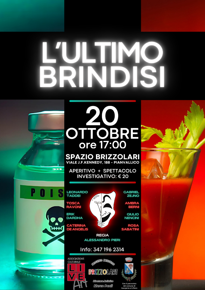 - Domenica 20 Ottobre ore 17:00 L'ULTIMO BRINDISI regia Alessandro Pieri con: Leonardo Taddei, Tosca Ravoni, Erik Dardha, Caterina De Angelis, Gabriel Zejno, Ambra Berini, Giulio Nencini, Rosa Sabatini