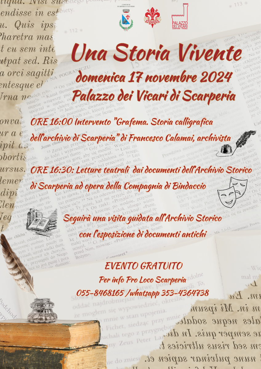 Una storia vivente, ore 16:00, Palazzo dei Vicari di Scarperia. Torna il tradizionale appuntamento con la storia a metà novembre; anche questo anno è previsto un intervento a tema archivistico, letture teatrali ad opera della Compagnia di Bindaccio tratte dai documenti dell’archivio storico preunitario di Scarperia, archivio che sarà poi visitato da tutti i partecipanti all’evento. Evento gratuito, aperto a tutti.