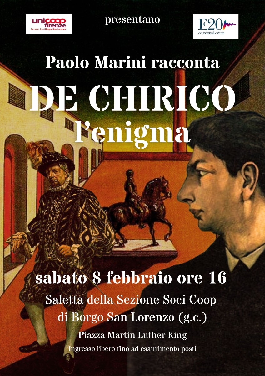 Sabato 8 febbraio alle ore 16, prsso la Saletta della Sezione Socili Coop di Borgo San Lorenzo ,appuntamento con l'arte di Giorgio de Chirico. De Chirico (1888-1978), uno degli artisti più famosi del Novecento non solo italiano, è anche, per un paradosso, uno dei meno conosciuti, a causa di una lunga serie di luoghi comuni e fraintendimenti della sua opera, spesso in malafede.