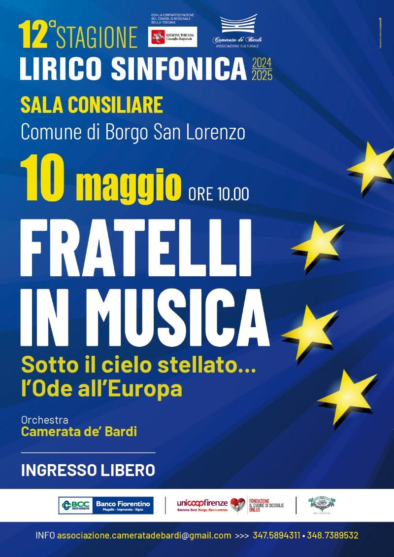Il concerto, organizzato dall'Associazione borghigiana, si avvale della compartecipazione del Consiglio Regionale della Toscana, è inserito nel più ampio calendario di eventi dedicati alla Giornata dell'Europa - Edizione 2025 ed è titolato “FRATELLI in MUSICA. Sotto il cielo stellato... l'Ode all'Europa”.