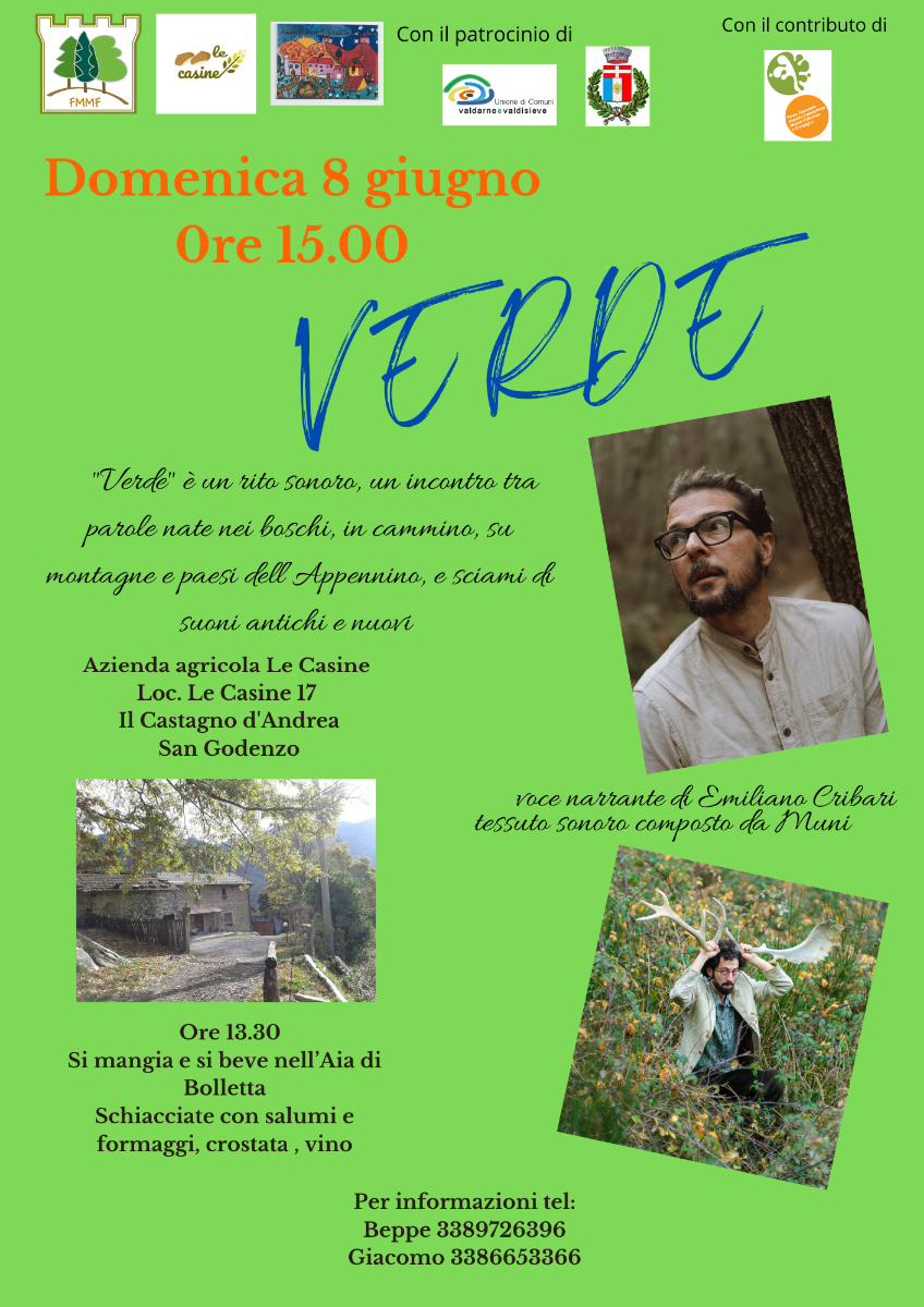 Dopo il pranzo la voce narrante di Emiliano Cribari accompagnata dal tessuto sonoro composto da Muni daranno vita a “Verde” un rito sonoro, un incontro tra parole nate tra i boschi, in cammino, su montagne e paesi dell’Appennino, e sciami di suoni antichi e nuovi.