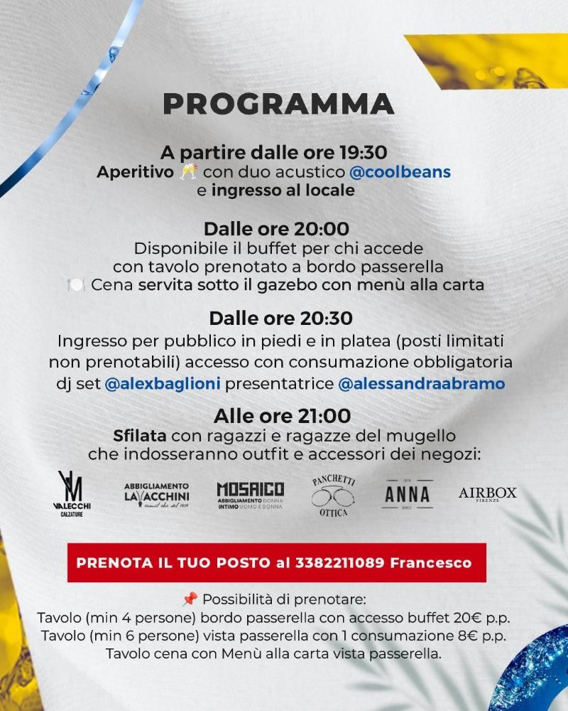 - Alle ore 21:00: Ammira la sfilata a cura di DIGIFLO - Agenzia Pubblicitaria, con ragazzi e ragazze del Mugello che indosseranno outfit e accessori di vari negozi: