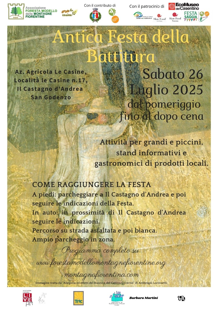 Il 26 luglio 2025, a San Godenzo, preparati a rivivere le tradizioni contadine con l'Antica Festa della Battitura del Grano! Un evento per grandi e piccini, che si terrà presso l'Azienda Agricola Le Casine, Località le Casine n.17, Il Castagno d'Andrea, dal pomeriggio fino a dopo cena.