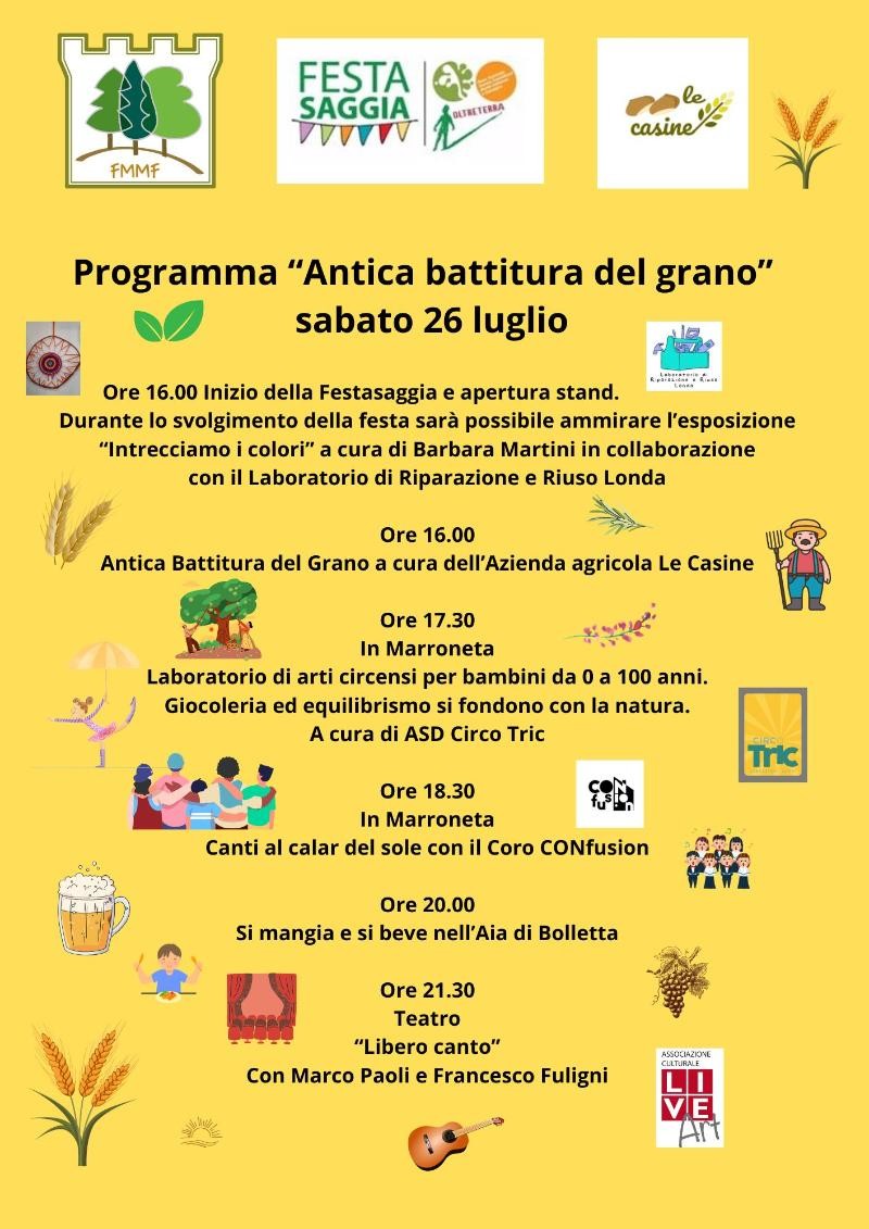 • Ore 16:00: La festa prende il via con l'inizio della Festasaggia e l'apertura degli stand. Durante l'intera giornata, avrai l'opportunità di ammirare l'esposizione "Intrecciamo i colori" a cura di Barbara Martini, in collaborazione con il Laboratorio di Riparazione e Riuso Londa.