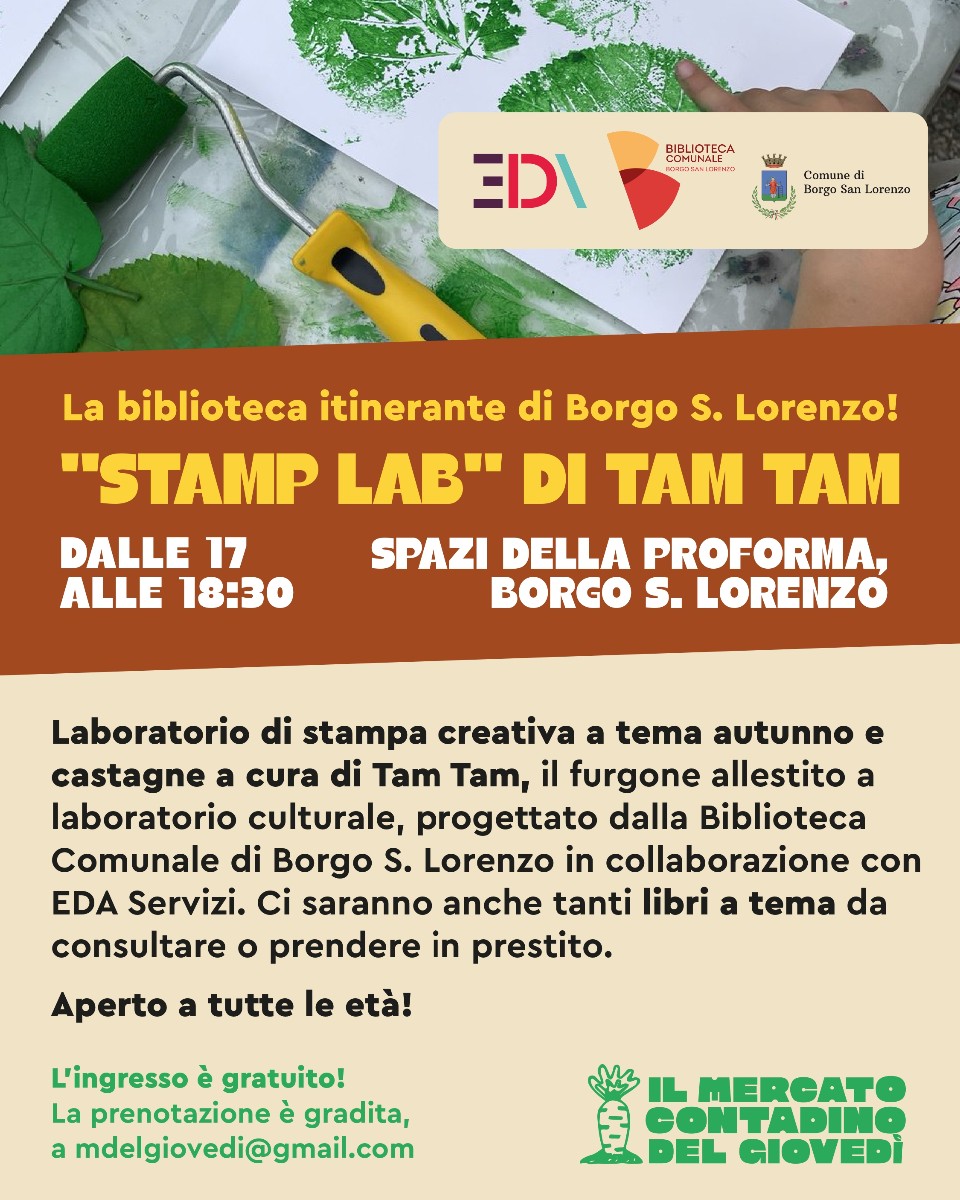 LABORATORIO ESPERENZIALE: “Stamp Lab” – laboratorio itinerante di Tam Tam - Sempre dalle 17 alle 18:30, la Biblioteca Itinerante di Borgo San Lorenzo propone un laboratorio di stampa creativa e tema autunnale, curato da Tam Tam, il furgone allestito e gestito dalla Biblioteca Comunale di Borgo San Lorenzo in collaborazione con EDA Servizi. Un’attività gratuita e aperta a tutte le età, con la possibilità di consultare e prendere in prestito libri.