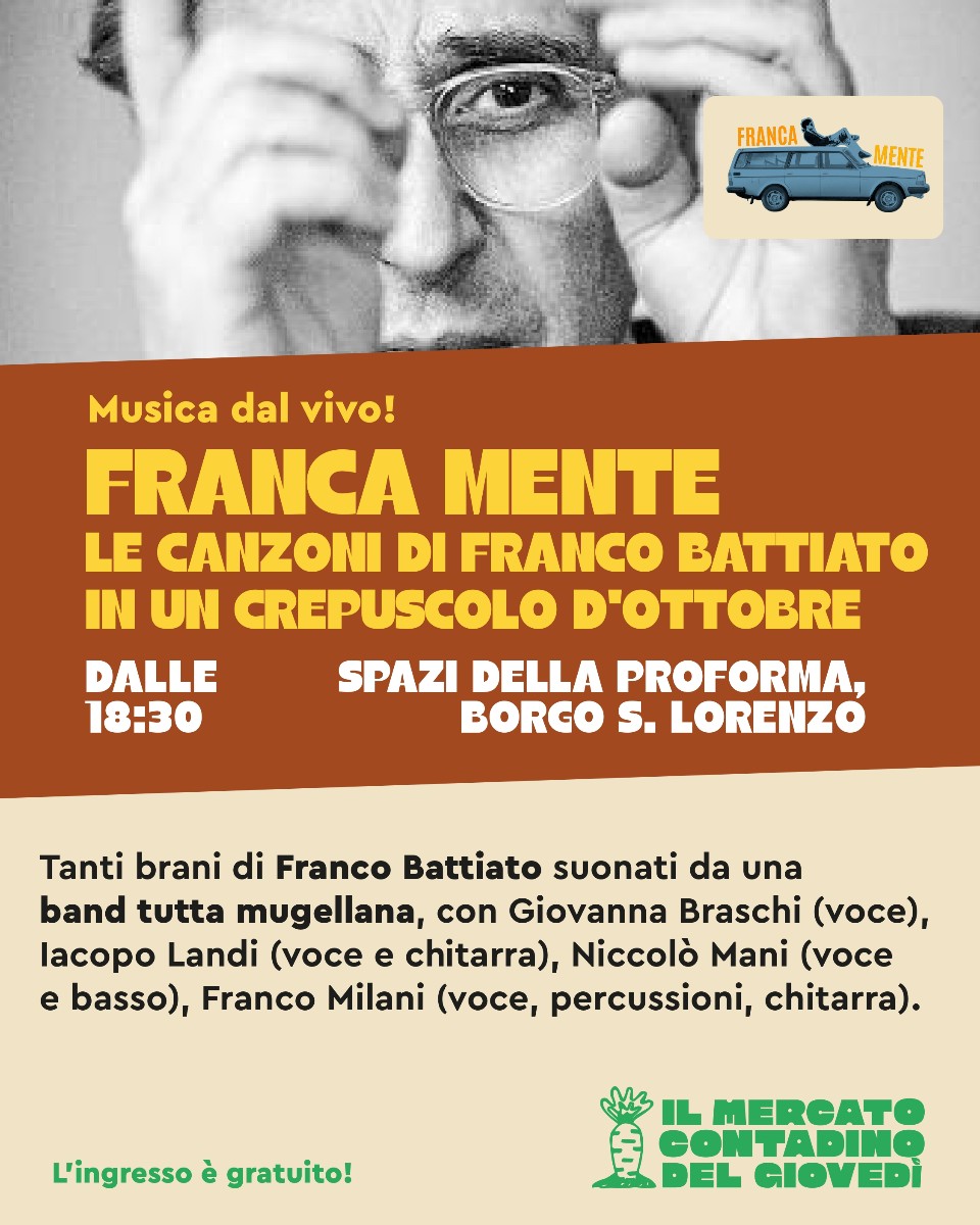 MUSICA DAL VIVO con Franca Mente - Dalle 18:30, musica dal vivo con Franca Mente, progetto che rende omaggio a Franco Battiato con arrangiamenti originali e sonorità intime. Sul palco: Emma Braschi (voce), Iacopo Landi (chitarra), Niccolò Mavi (voce e percussioni) e Franco Milani (voce e chitarra).