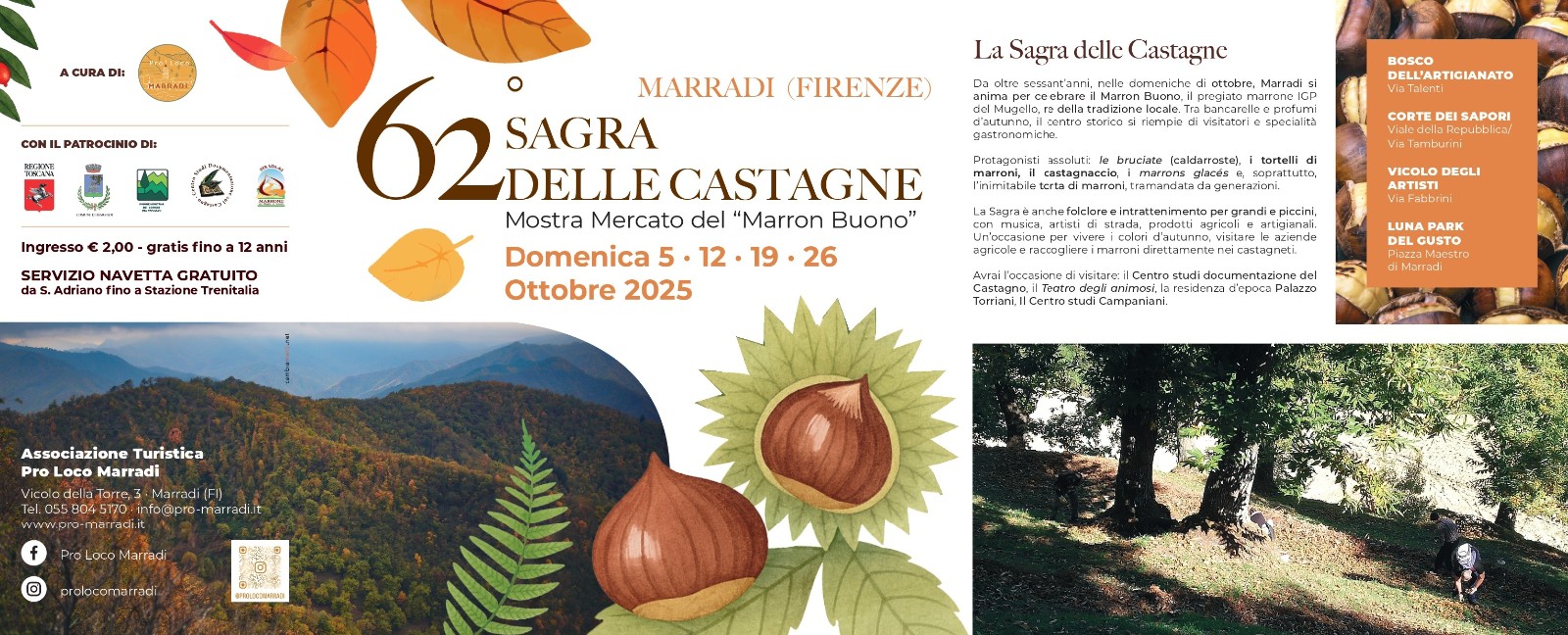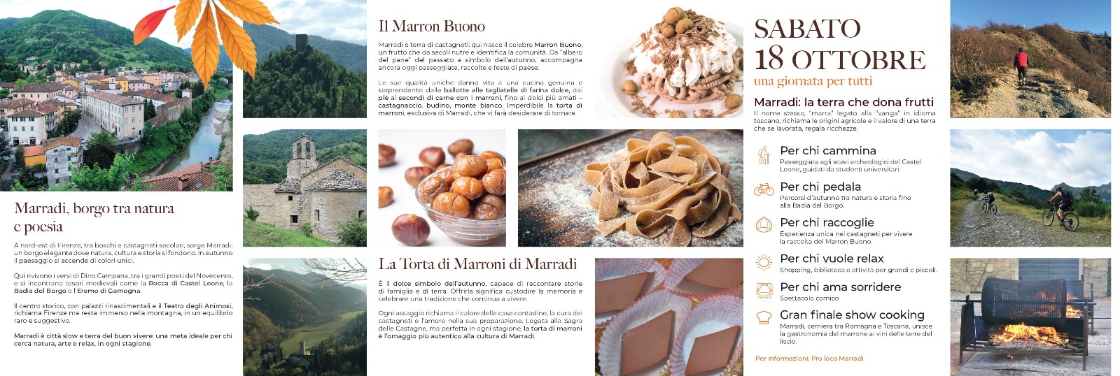 - Sabato 18 ottobre è in programma una giornata speciale “Marradi: la terra che dona frutti”, con passeggiate guidate, escursioni in bici, raccolta di castagne, relax, spettacoli comici e un gran finale di show cooking dedicato alle eccellenze del territorio.