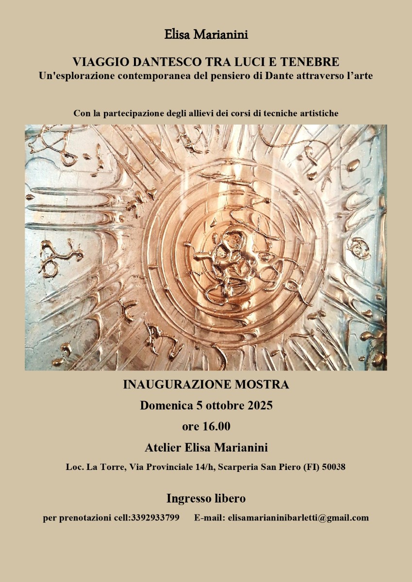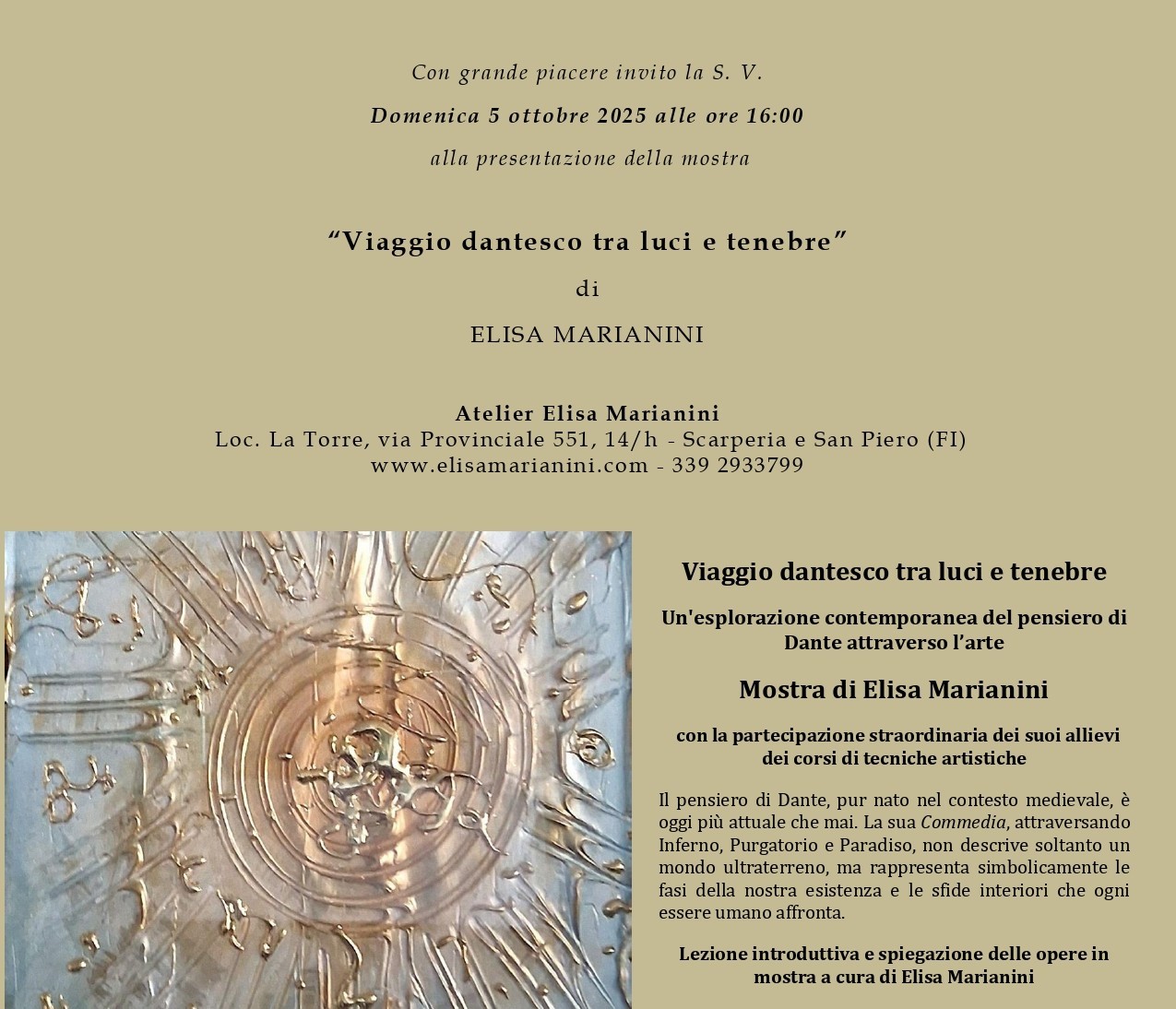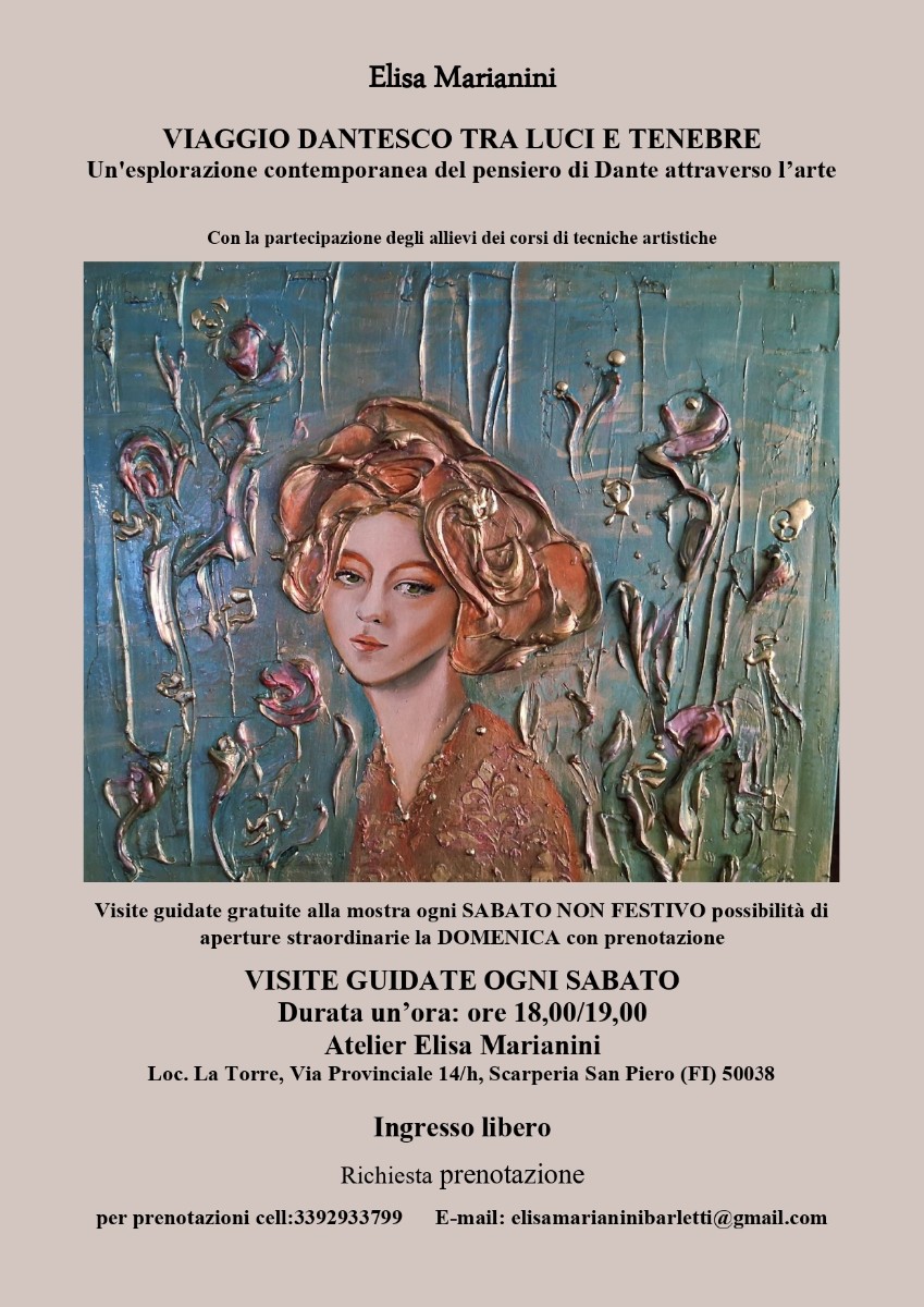 La mostra “Viaggio dantesco tra luci e tenebre” di Elisa Marianini  - con la partecipazione anche di alcune opere dei suoi allievi - nasce come omaggio visivo alla potenza universale e senza tempo della Divina Commedia, opera cardine della nostra cultura. Ma è anche e soprattutto un invito a guardarsi dentro, a compiere — come Dante — un viaggio personale nelle profondità dell’animo umano.