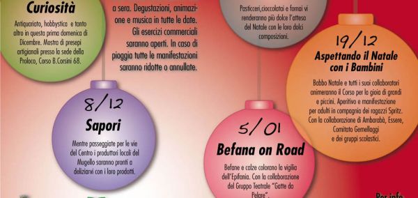 Barberino di Mugello – 5-8-12-19 Dicembre e 5 Gennaio5 Dicembre: antiquariato, hobbystica, mostra di Presepi artigianali presso la sede della Proloco, Corso B. Corsini, 68.8 Dicembre: degustazione e vendita di prodotti tipici per le vie del paese.12 Dicembre: dolci composizioni di pasticceri e fornai.19 Dicembre: aspettando il Natale con i bambini.5 Gennaio: Befana on the Road.Info: tel. 347…